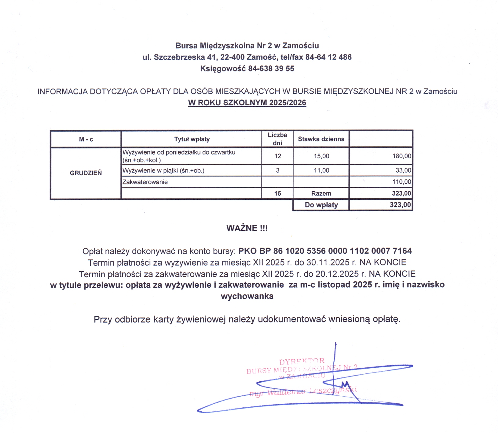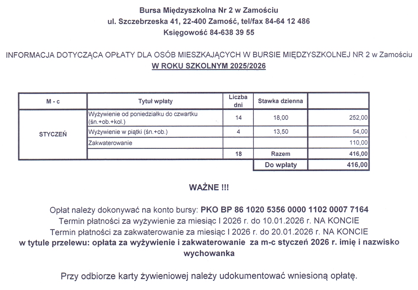 W grudniu proszę nie dokonywać wpłat za miesiąc styczeń 2025r.